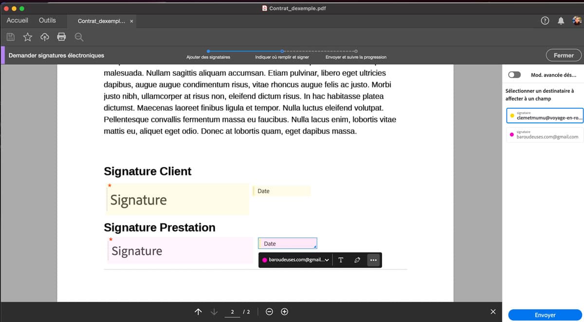 La signature se passe avec Adobe Acrobate pro. Tu peux choisir l’ordre de signature en fonction des destinataires, les différents types de données à entrer .