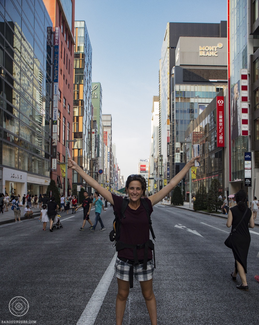 Notre hôtel est idéalement placé pour faire du shopping et on se dit que ça serait vraiment pas mal de faire quelques emplettes : après le fruit picking en Australie et les différents lavages à la main, nos t-shirts sont jaunis et tout distendus…. On vous rappelle que voyager en sac à dos, ça limite à 3 t-shirts, un short et deux pantalons. Au bout de 10 mois de voyage, un tour chez H&M s’impose. Pour nous, à ce moment là, c’est ce qui se rapproche le plus de Noël ! Le quartier de Ginza est l’un des premiers quartiers à s’être modernisé et il y a encore de nombreuses galeries d’art.