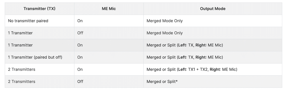 Par contre, si tu utilises les 3 micros en “split mode”, les sources audio des 2 micros transmetteurs (Tx) seront fusionnées en une seule piste et celle du récepteur sera indépendante.
